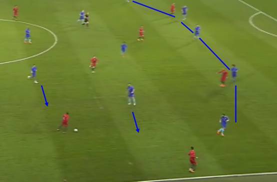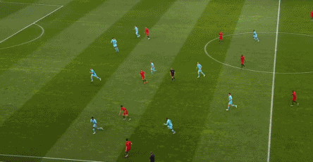 上图转换阶段锋线上的两名球员进行牵制给后排队友创造插上的机会,结果费尔南德斯受限于身体素质停球和射门都很勉强。没有给西莱森创造实质性的威胁。