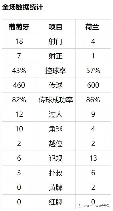 全场唯一进球发生在第60分钟,贝尔纳多-席尔瓦前场左肋得球突入禁区,随后横传,格德斯中路右脚抽射破门,葡萄牙1-0荷兰。