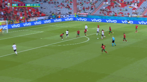 葡萄牙队要换人了,穆迪尼奥上场了。球丢了,但是这是一个非常好的传球,德国队的机会。但是当他们拿到球的时候,已经到了边路。厄齐尔接到球后,尝试了一次射门。后卫线没有站好位置,如果他们站好了位置,帕纳里笑就很难了。因为这个射门的位置非常接近点球点,而且是迎头攻门,所以帕纳里笑没有能够扑到球。