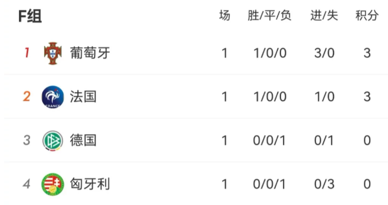 对于这三强来说,每一场比赛都非常重要,不管是任意两强之间的直接对话,还是和唯一的弱旅匈牙利队的比赛,他们都必须争取胜利,乃至争取更多的净胜球,这样才能在出线乃至出线之后的淘汰赛的争夺中占得先机。第一轮小组赛战罢,葡萄牙队和法国队各积三分分列小组第一和第二;德国队因为首场失利排在了第三,匈牙利队不出意外位居最后一位。
