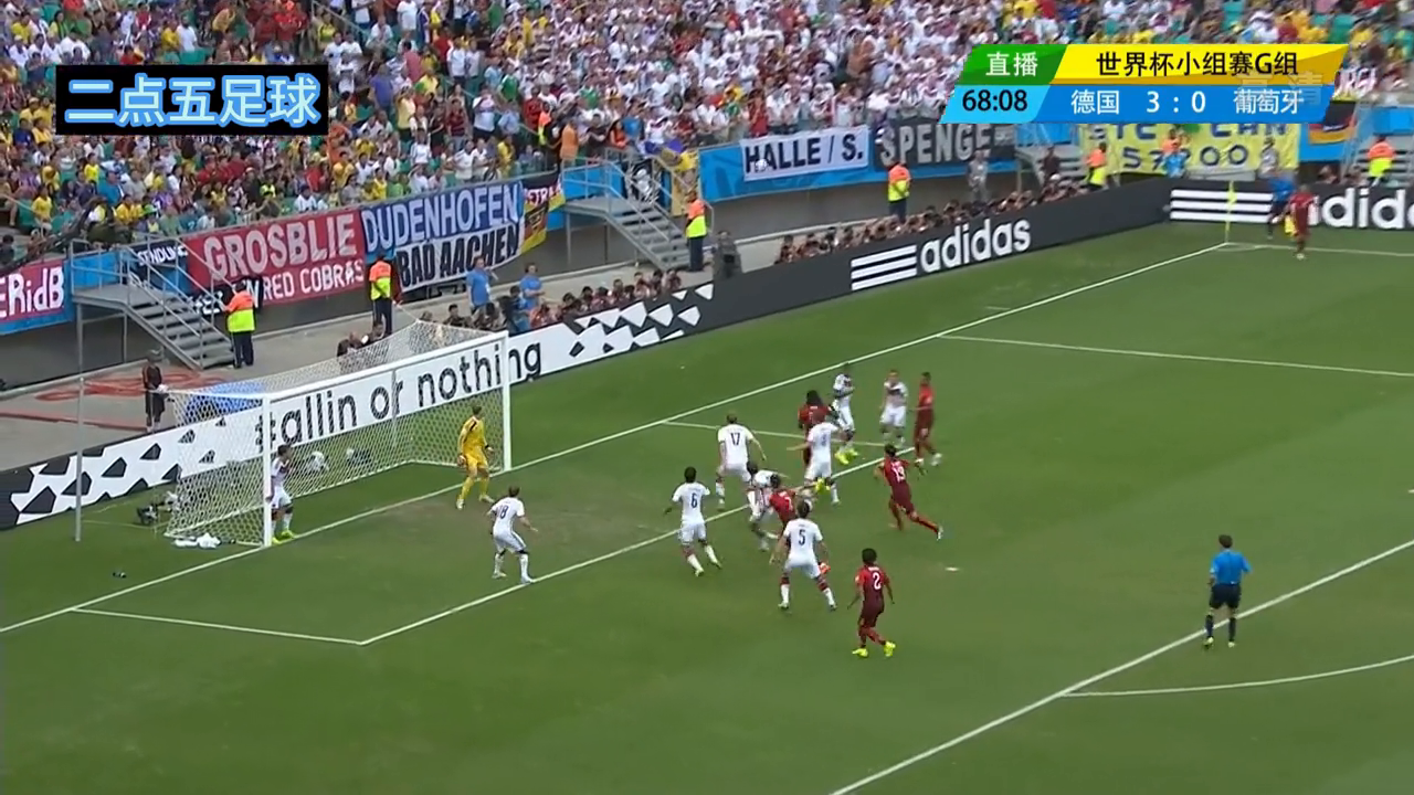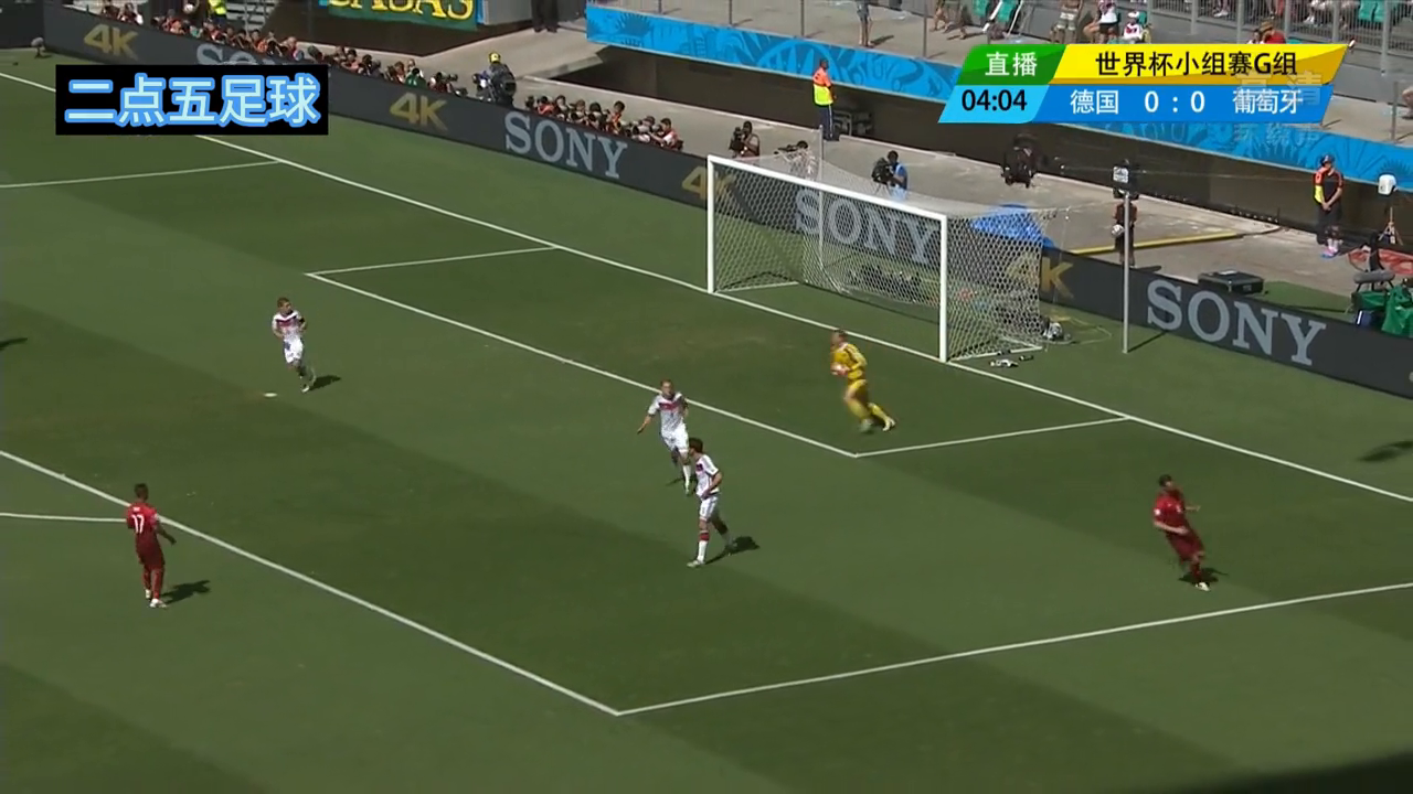 德国队的反击很危险,维尔卡贝亚的身后只有一名防守球员,但c 罗没有把握住这个机会。德国队的传球被主裁判第二次阻挡,外围的射门被埃德在禁区内摔倒,主裁判并没有判罚点球。这是德国队的好机会,但是他们并没有把握住。德国队的第二次进攻,再传回给队友,这是一次不错的配合。希尔勒的横传被门将帕特里希奥精准地垫进了球门,这是德国队的第四个进球。这个比分已经追平了德国队在上一届南非世界杯的第一场比赛中的胜利。c 罗的射门速度非常快,像一颗炮弹。诺伊尔虽然没有接住球,但球的速度非常快。