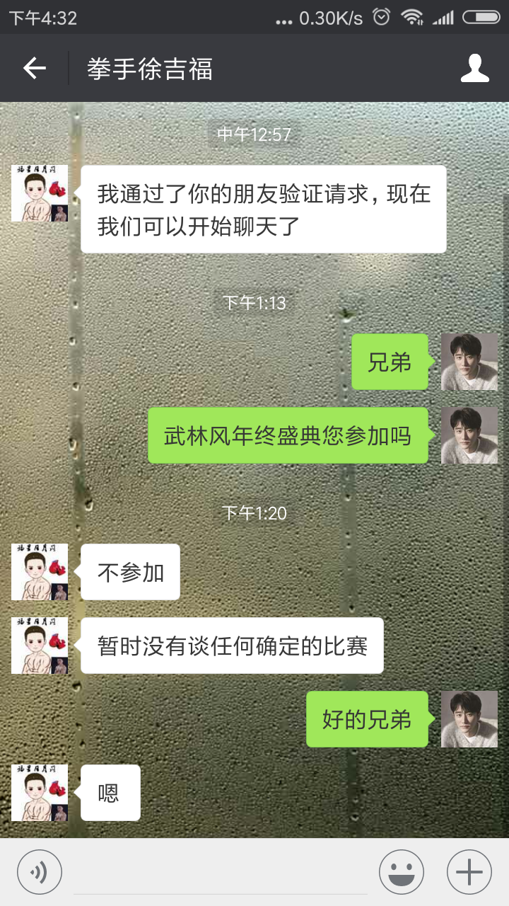 其中战警谢雷与冷面杀手李宁将赢来自己的复仇战,战警谢雷曾被伊利亚斯布莱德读秒,输掉了比赛,而李宁曾与朝久裕贵大战四个回合,遗憾落败。另外还有一个消息是,福星日月闪徐吉福已经确定不参加全球功夫盛典,今天我联系到徐吉福本人,他说:目前没有任何确定的比赛。