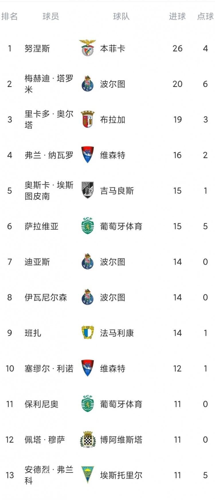 最佳射手——努涅斯(26球,本菲卡)