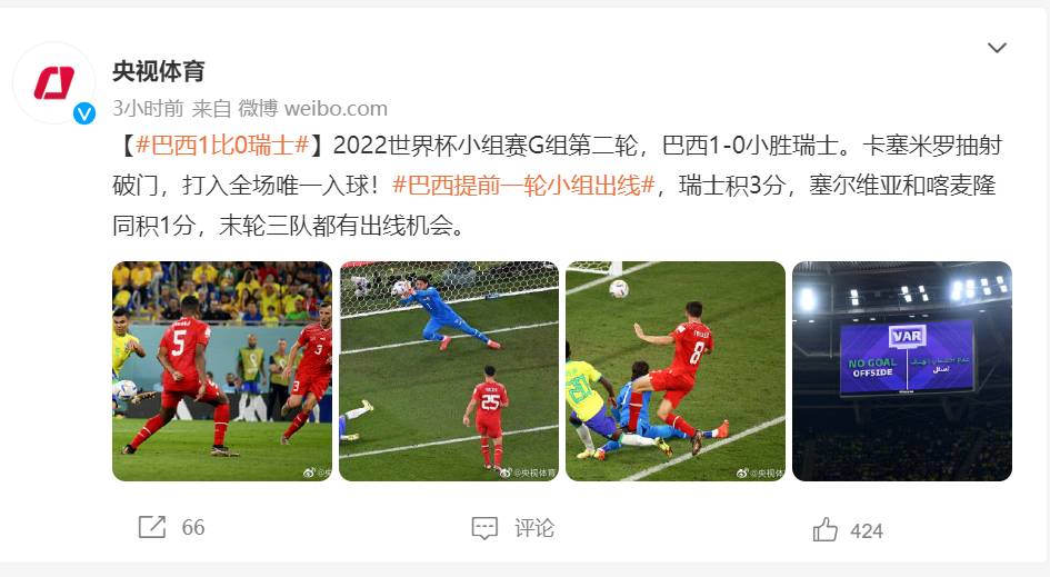 2022世界杯小组赛G组第二轮,巴西1-0小胜瑞士。卡塞米罗抽射破门,打入全场唯一入球!#巴西提前一轮小组出线#,瑞士积3分,塞尔维亚和喀麦隆同积1分,末轮三队都有出线机会。
