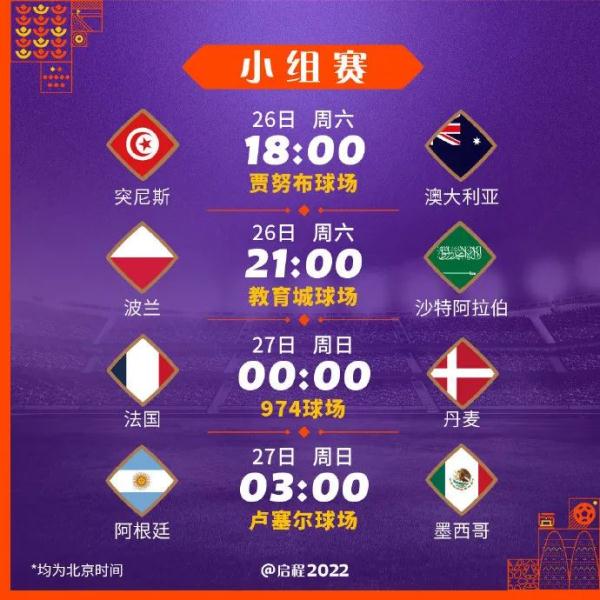D组18:00突尼斯对阵澳大利亚;C组21:00波兰对阵沙特阿拉伯;D组00:00法国对阵丹麦;C组3:00阿根廷对阵墨西哥。