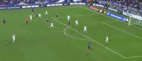 第25分钟,法国队左路造攻势,本泽马禁区线外脚后跟直塞,格列兹曼带球横突晃开角度,左脚外脚背推射打入远角,法国队1-0领先!