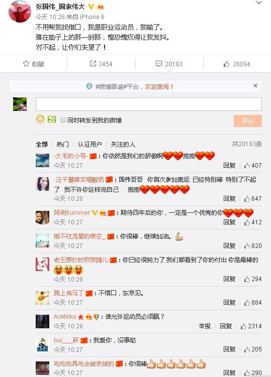 其中,“90后”中国选手张国伟一直以其良好的赛场表现和每次赛后及具个人特色的庆祝方式引发大家关注。今日赛后,张国伟在其个人认证微博上说:“不用帮我找借口,我是职业运动员,我输了。落在垫子上的那一刹那,惶恐愧疚得让我发抖。对不起,让你们失望了!”。得到留言一片支持。