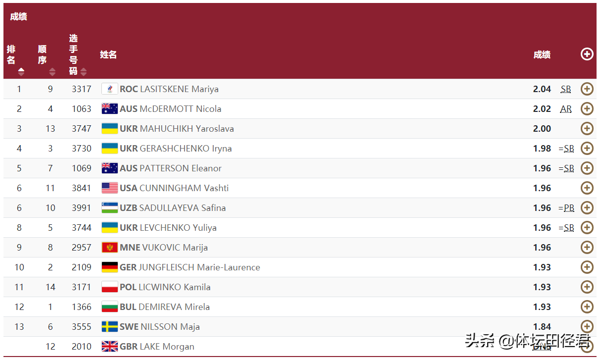 但玛胡奇克两次冲击2米04失败,麦克德莫特用尽三次机会也没有过杆,拉西茨科尼展现顶尖实力,第二次跳过了2米04高度,拿到金牌,握紧双拳怒吼,刷新玛胡奇克赛前创造的2米03今年世界第一成绩,拉西茨科尼经过考虑没有选择更高的2米06,玛胡奇克以2米00拿到铜牌,麦克德莫特2米02获得银牌。