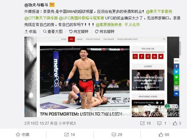 外媒报道:李景亮 是中国MMA的超级明星,应该给他更多的待遇和机会! UFC的奖金确实太少了,无法养家糊口。李景亮现在有自己的房,有自己的车吗?!!!