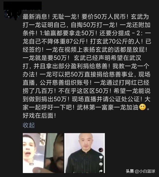 一龙已经公开表示民间挑战赛的首场比赛是跟“打假先锋”玄武打,后续会公布细节,一龙与玄武已经签订了协议,不过有知情人士曝出,一龙向玄武索要的出场费高达50万元,太扯淡了,你摆擂台人家挑战你,结果挑战者还出钱。