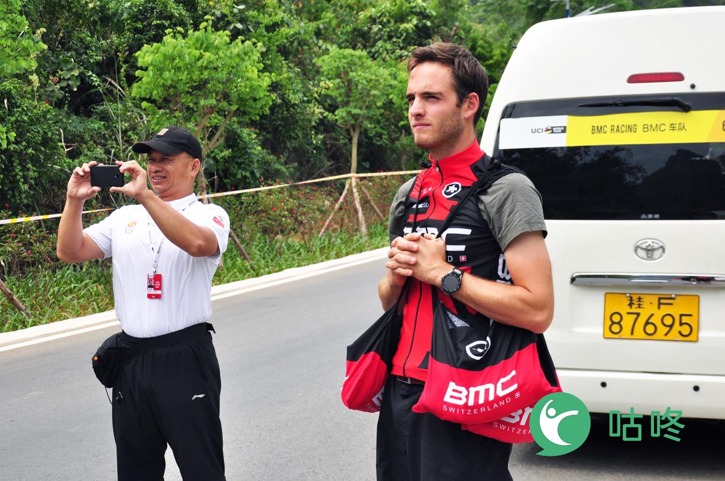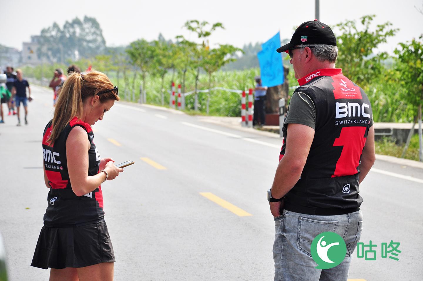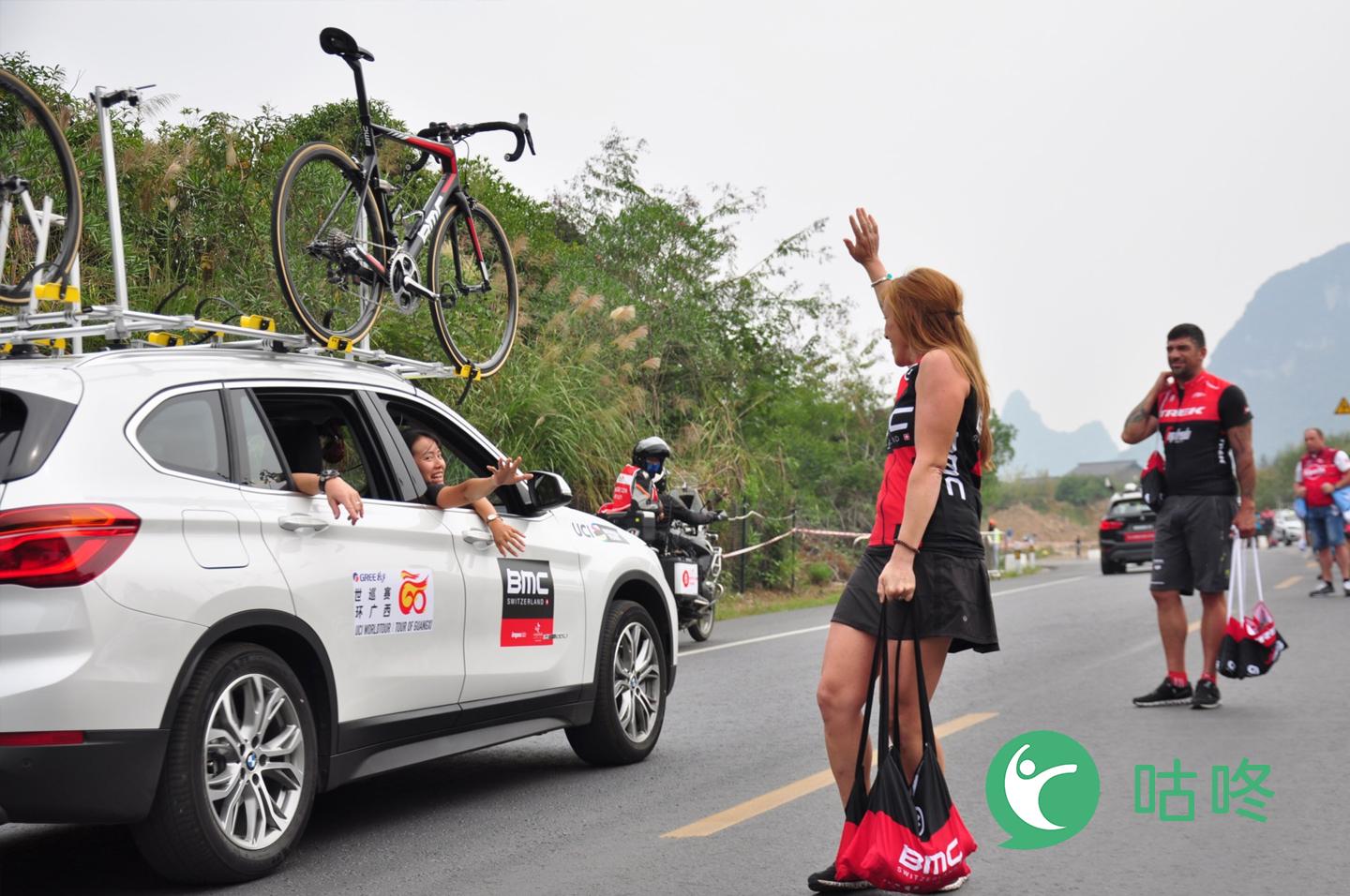 车队的技术后援车也会随车手集团路过补给点,Auxi和坐在车内的车队工作人员,来自广西本地,在本次赛事中为对内执行翻译等工作的Alice挥手致意,BMC在本次环广西自行车赛中的成绩十分出色,每一名车队工作人员的心情都非常愉快。