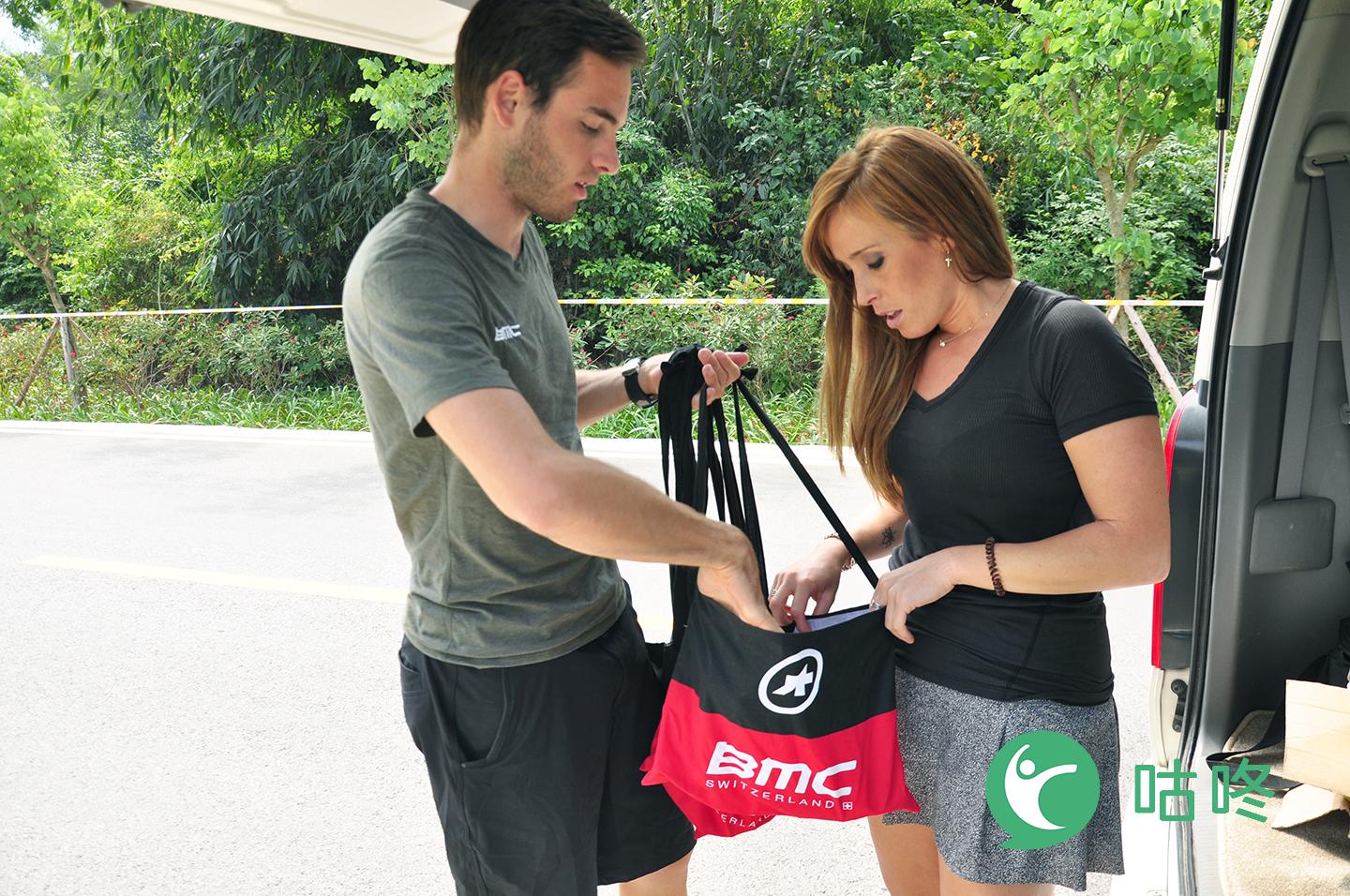 本次格力-环广西公路自行车世界巡回赛,BMC车队共派出7名车手参赛,后勤人员会准备7个小挎包,在包内装上相同种类和数量的食品及饮用水。两名工作人员分别负责3名及4名车手,在他们到达补给点时将补给包送到他们手中。一般来讲,后勤补给车会先于车手1小时左右到达补给点,以留出充分的工作时间。下图为Anthony和Auxi正在确认包内补给品是否按规定放置妥当