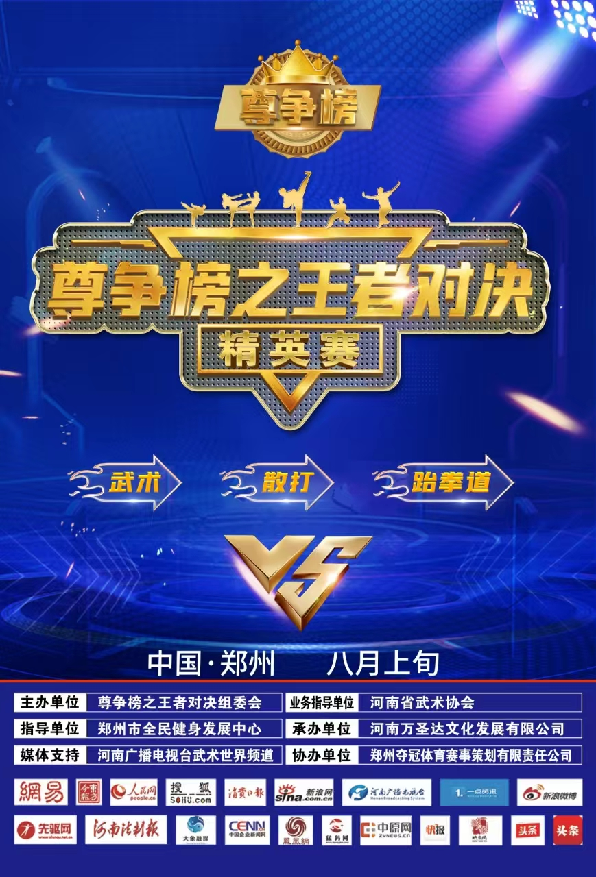 由河南省武术协会、郑州市全民健身发展中心为指导单位,河南广播电视台武术世界频道为媒体支持单位,尊争榜之王者对决组委会主办,河南万圣达文化发展有限公司承办的“尊争榜之王者对决”2024年武术散打跆拳道大赛,即将于2024年8月3日在河南郑州打响巅峰之战,敬请期待!