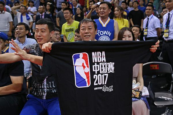 2017年10月5日,2017NBA中国赛深圳站。球迷举起印有“NBA中国赛2017”字样的纪念T恤。 本文图均为 视觉中国 图