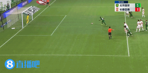 第51分钟,法比奥主罚点球打球门右下角,邹德海判断对方向但没能扑到皮球!北京国安5-1长春亚泰↓