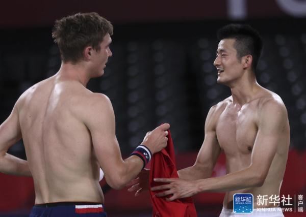 8月2日,安赛龙(左)与谌龙赛后交换球衣。新华社记者 欧东衢 摄