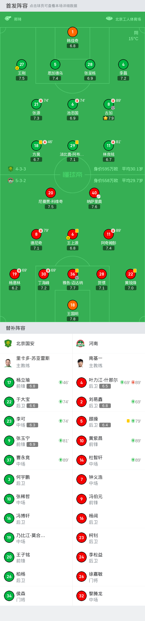 赛前,北京国安已经锁定了联赛第四名,而河南队处在“坐八望七”的位置,虽然没有成绩压力,但比赛精彩程度丝毫没有打折扣,河南队依旧是派出了5名外援首发,国安队也是尽遣主力。现场,北京工体涌入4.6万余名球迷,营造出了强大的主场氛围。