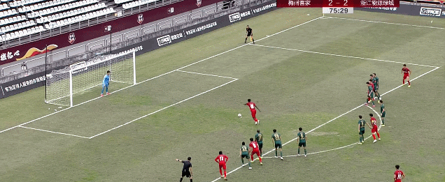 第75分钟,梅州右路传中到禁区,迪诺防守推倒梅州球员,裁判指向点球点!梅州获得点球!随后,敦比亚点射命中!梅州3-2绿城!↓