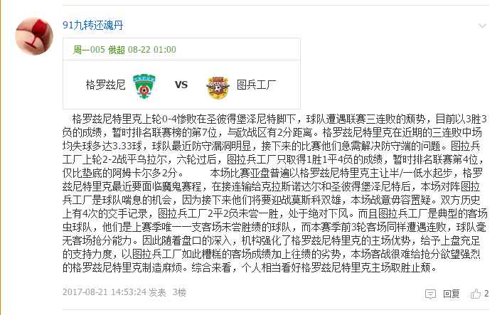 4. 格罗兹尼特里克最近要面临魔鬼赛程,在接连输给克拉斯诺达尔和圣彼得堡泽尼特后,本场对阵图拉兵工厂是球队喘息的机会,因为接下来他们将要迎战莫斯科双雄**陆军与火车头,本场抢分欲望强烈,战意可信。