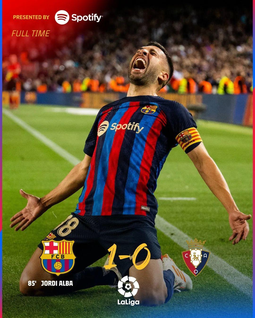 比赛第86分钟,替补登场的阿尔巴打破僵局!!!巴萨1-0奥萨苏纳!