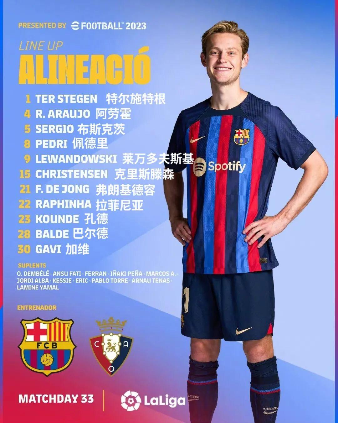 巴萨首发:13-佩尼亚、2-库巴西、23-孔德、24-埃里克-加西亚、35-杰拉德-马丁、36-多明戈斯、8-佩德里、14-巴勃罗-托雷、7-费兰-托雷斯、18-保-维克托、9-莱万