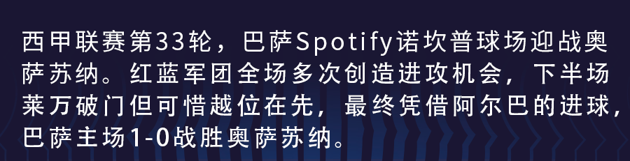 全场比赛结束,巴萨主场1-0战胜奥萨苏纳,全取三分!