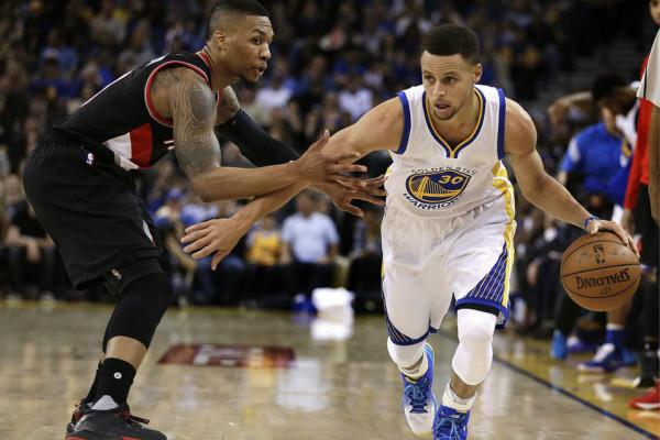 四次正面交锋里,勇士百回合能轰下将近120分,其中杜兰特33.7分钟就砍下29.3分,库里(3场)30.9分钟添上27.3分。库里会频繁利用有球或者无球绕着中锋跑,一来利拉德和迈克伦姆都有体型偏小,容易受阻于掩护以及难以干扰投篮的问题,二来当时还在的普拉姆利或者莱昂纳德换防机动性有限,再注重护框就会给出很大的空间。