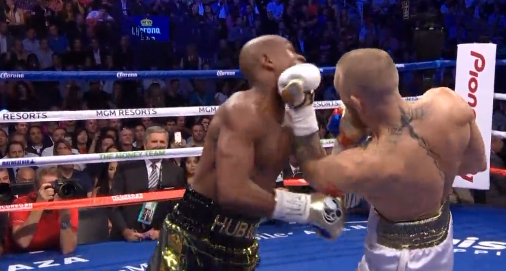 不过第四回合开始,嘴炮貌似体能开始下滑,移动速度和出拳频率也开始下滑。梅威瑟比赛经验何等丰富,马上抓住机会,步步紧逼不希望给嘴炮喘息的机会,搬回了不少点数。第六回合体能明显下降的嘴炮,连续进攻的能力越来越差,给了梅威瑟多次反击机会,让梅威瑟打出不少后手重拳。全球拳迷的瞩目中,大家看到了难得一见的场景,擅长控制梅威瑟开始曲臂防守,向坦克一样向前推进,与对手中近距离拼拳。嘴炮在UFC中的风格本就是以中远打击为主,完全不适应职业拳击这种中近距离的鏖战。同时对12回合的拳击比赛的体力分配也不擅长,疲于应对的他,甚至使出了MMA技术中的拿背技术来缓解体能压力。到了第九回合,嘴炮体能已经基本耗尽了,完全靠搂抱和意志在硬撑。第十回合嘴炮的“跑车”终于烧尽了燃油,被梅威瑟连续追击并打出有效重击,最终摇摇欲坠的嘴炮被裁判终止了比赛。