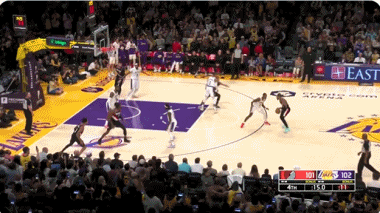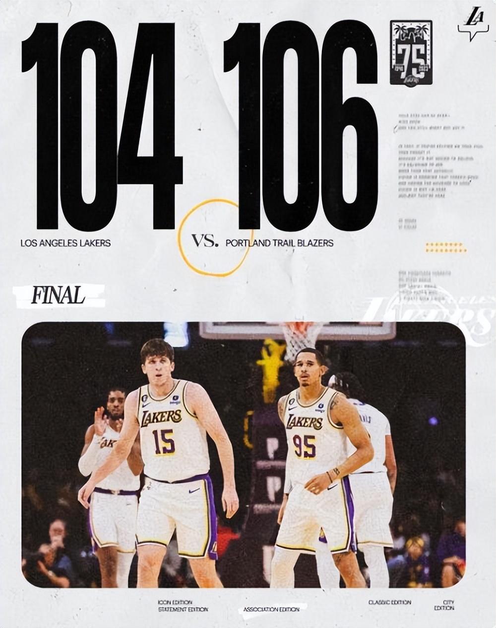 詹姆斯突破无人补防直接扣篮,但杰拉米-格兰特杀到篮下打进完成准绝杀,詹姆斯的后仰扳平球跳投不中,湖人惜败。