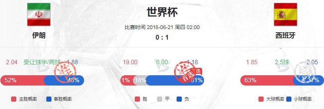 再来是西班牙,谁都没料到西班牙本场面对伊朗会踢得如此艰难。小炮赛果预测西班牙赢球,盘口预测西班牙输盘,精确的告诉大家,这场西班牙不多不少,就赢1个球 !只可惜伊朗赛中曾打进一个球被吹掉,不然本场很有可能打成2-1,那样的话大小球也将命中!