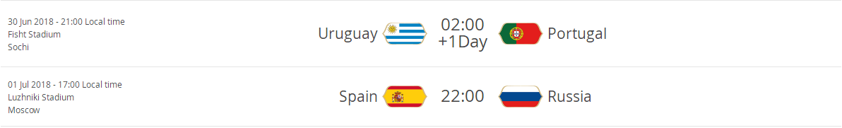 根据世界杯1/8决赛的对阵规则,A1的乌拉圭将对阵B2的葡萄牙,比赛在7月1日凌晨2点进行,比赛地点在索契。A2的俄罗斯将对阵B1的西班牙,比赛在7月1日晚22点进行,比赛地点是莫斯科的卢日尼基球场。