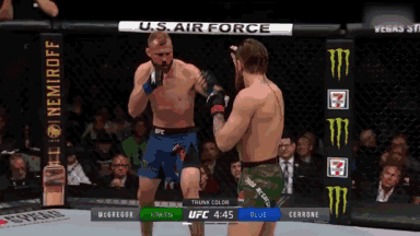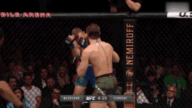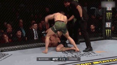 比赛一开始,嘴炮康纳侵略性十足,一上来就是一记边腿,然后一记膝顶加一套组合拳打的牛仔节节后退,康纳将牛仔逼到笼边之后,连续集中牛仔的面部,牛仔被突如其来的进攻打的晕头转向,不知所措,最终裁判终止了比赛,康纳TKO获胜,用时仅仅40秒。