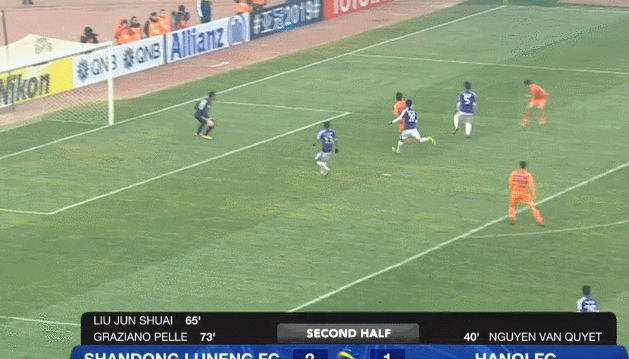 第65分钟,金敬道前场中路接蒿俊闵回传挑传禁区,刘彬彬沿右路突入禁区抢点争顶将球摆渡到门前,河内FC中卫解围失误,埋伏在门前的刘军帅随即抢点捅射得手,1-1,鲁能追平比分。 第68分钟,阮文决前场右路接队友传球起右脚传中,阮光海禁区内抢点一蹭,埋伏在门前的奥赛尼将球卸下随即转身抽射,皮球稍稍偏出立柱。