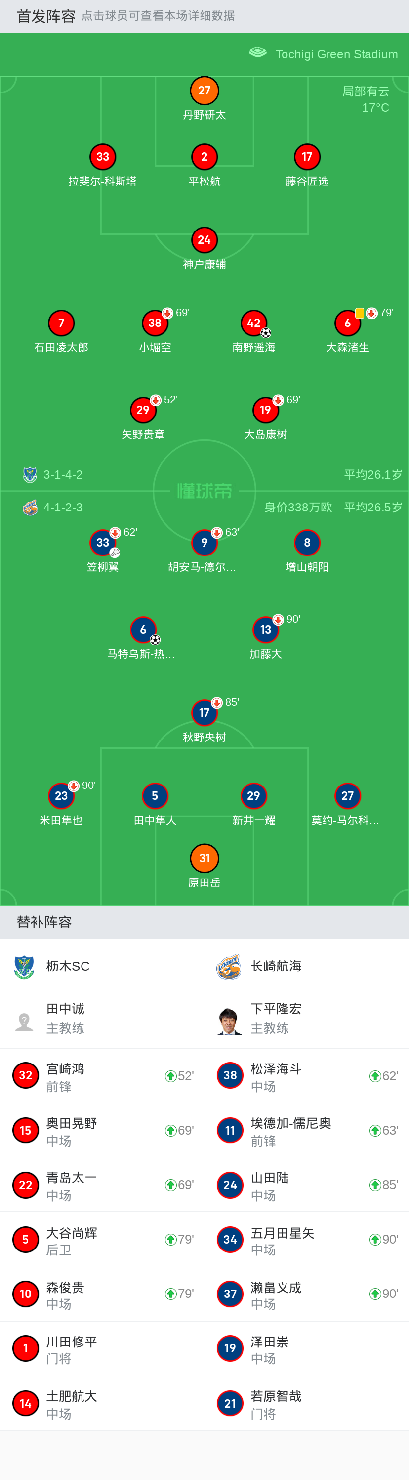 枥木SC 首发:29-矢野贵章, 27-丹野研太, 19-大岛康树, 33-拉斐尔-科斯塔, 17-藤谷匠选, 7-石田凌太郎, 38-小堀空, 6-大森渚生, 24-神户康辅, 42-南野遥海, 2-平松航