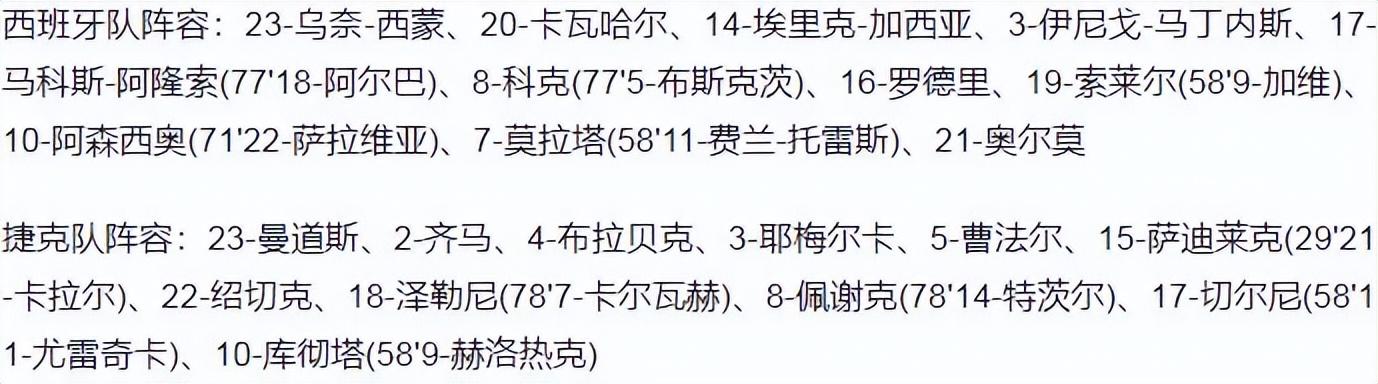 西班牙替补:1-桑切斯、13-拉亚、2-阿斯皮利奎塔、4-保-托雷斯、15-迭戈-略伦特、18-阿尔巴、19-索莱尔