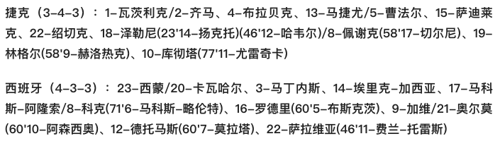 捷克首发:23-曼杜斯、3-杰梅卡、4-布拉贝茨、2-齐马、18-泽勒尼、22-绍切克、15-萨迪莱克(30分钟,21-克拉尔)、5-曹法尔、17-切尔尼、10-库什塔(59分钟,11-尤雷茨卡)、8-佩塞克(60分钟,9-赫洛泽克)