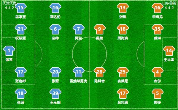 再看主场作战的天津天海,球队阵型其实接近于433。张鹭依然是首发门将,U23小将温家宝与权敬源、张晓彬和张诚组成球队防线。中前场方面,裴帅、U23小将张源和王永珀相当于三后腰站位,两名新进外援阿兰、雷纳迪尼奥则与郑达伦组成了球队进攻线。此外,另几位鲁能旧将姚均晟、王晓龙、杨旭则坐在替补席上。