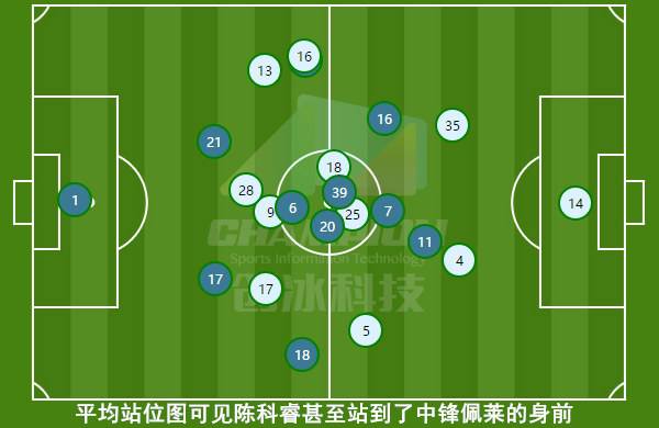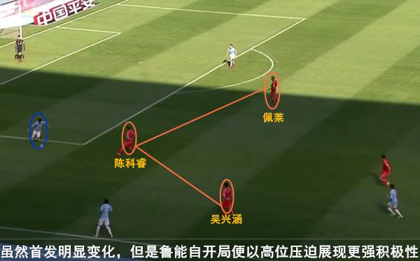 在这些“新人”中,小将陈科睿的位置非常靠前,甚至要比中锋佩莱更为接近对方球门。李霄鹏教练这样的选人和布阵显然有其目的:一方面,陈科睿如此靠前的位置无疑为佩莱的支点作用找到了一个向前的传递目标,这让对方中卫不敢轻易跟随回撤的佩莱而失去防守位置;另一方面,陈科睿或许也深知自己的登场时间不会很多,因此在前场展现了不知疲倦的疯狂逼抢,这让主队中后场的组织和疏导自然深受影响。