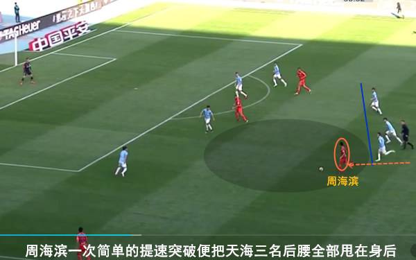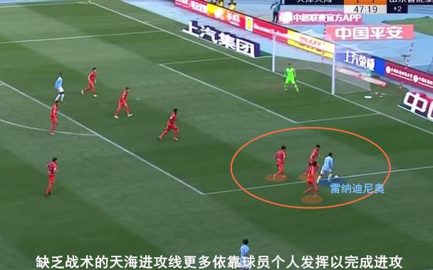 回顾鲁能在本场比赛的第一粒失球,看似吴兴涵如罗本附体般完成了一粒精彩内切射门,但是在他接到佩莱的中场转移时其实仅面对对方一名防守球员,可见天海的整体后防站位明显缺乏连接。更致命的是,当吴兴涵持球内切后低射破门时,天海的后腰球员始终没有及时补过来加以协助。