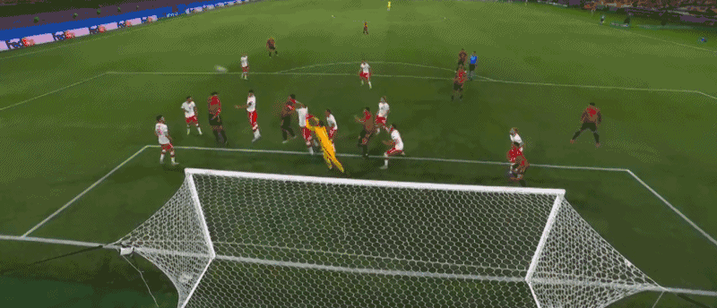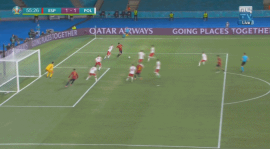 第83分钟,西班牙左路传中到禁区内,萨拉维亚胸部做球,莫拉塔跟上抽射被什琴斯尼封堵,随后费兰-托雷斯吊射高出横梁。↓
