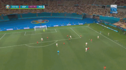 第33分钟,,奥尔莫在弧顶处被波兰后卫格利克推倒,裁判给了西班牙队一个任意球。莫雷诺主罚任意球,他的射门绕过人墙,也偏出了左侧立柱。