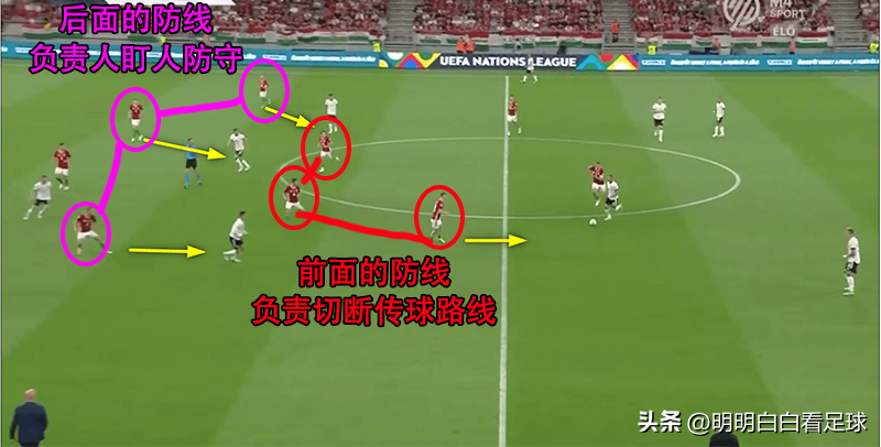 上次我们聊过,匈牙利的防守特点是在中路囤积重兵,前后两层包围对手前锋,不让对手前锋有接球机会。