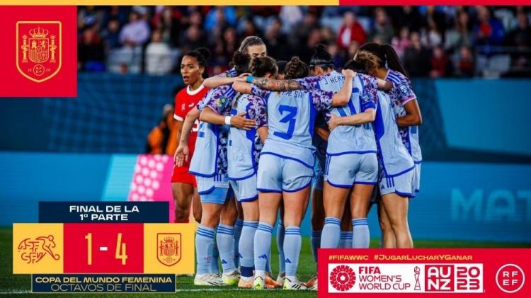 直播吧8月5日讯 北京时间8月5日13:00,女足世界杯十六强瑞士迎战西班牙的比赛,上半场邦马蒂双响,科迪纳回传乌龙球后将功补过抽射破门,雷东多头球建功,半场结束,西班牙女足4-1瑞士女足。