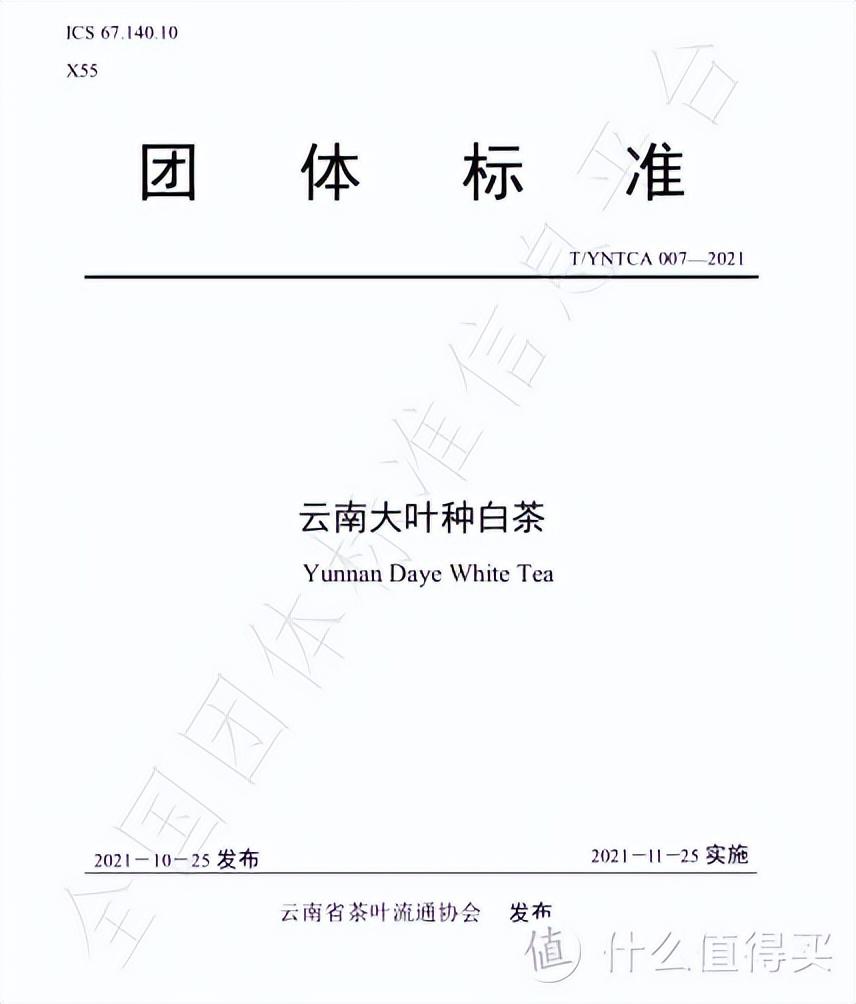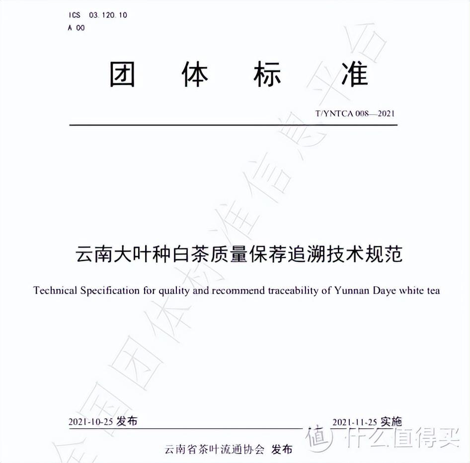 2021年10月25日,《云南大叶种白茶》和《云南大叶种白茶质量保荐追湖技术规范》 两项团体标准正式发布。标准统一了云南白茶的定义、范国、类型、制作工艺、感官审评术语、 检测指标等,充分突出了云南大叶种白茶的特点。