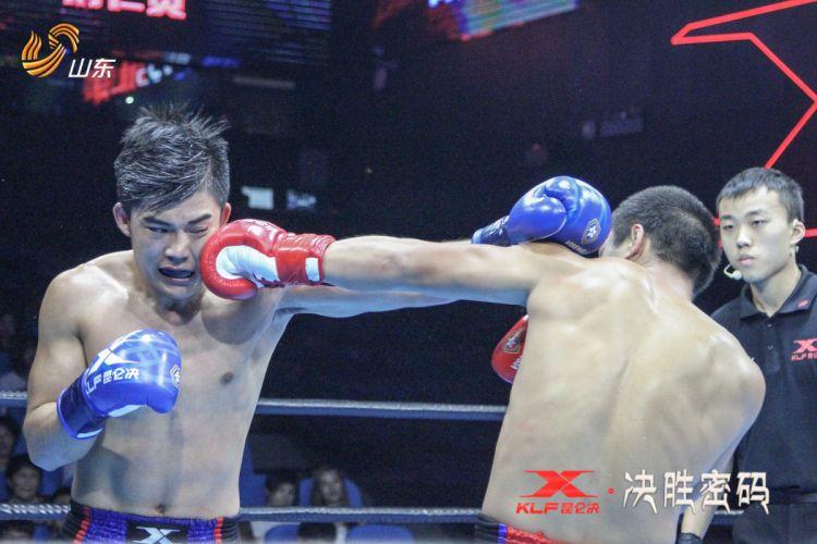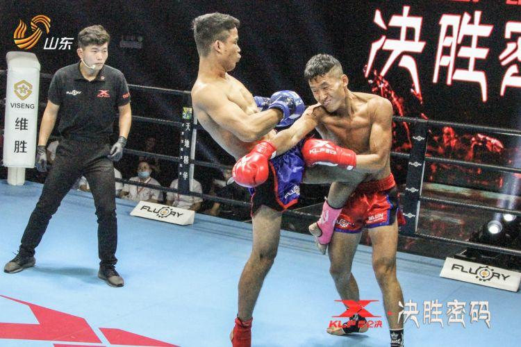 来自泰国的阿兰是位有着255场比赛经历的30岁老将,对垒的红方武汉队员金昊却只有过3场比赛经历,这样的差距会不会决定本场的结果?进入比赛,红方开始的进攻异乎寻常的猛烈,而蓝方在挡住第一波攻击后逐步掌控了节奏和主动权,频繁的高扫腿和膝顶战术十分奏效。第二回合,蓝方继续稳扎稳打,数次击倒对手,牢牢掌握场上优势。到第三回合,红方的金昊已是强弩之末,成为蓝方阿兰频频拳打脚踢的沙袋,毫无还手之力,在第三回合的2分27秒被蓝方膝顶重击KO。