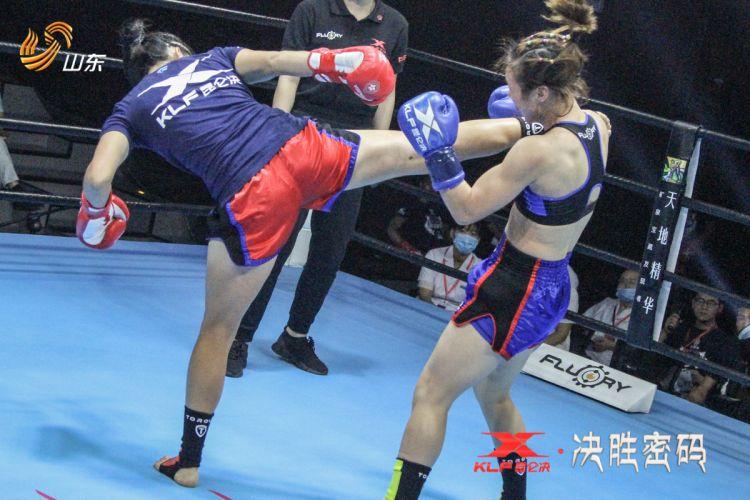 这场比赛的红方匡菲无论比赛经历还是身高臂长都占据优势,但一进入比赛蓝方队员更加主动积极,侵略性更强,出拳出脚次数占据上风。至第二回合,红方开始调整进攻方式,频繁使用高扫腿攻击,有效杀伤克制了对手。第三回合,蓝方耿春蕾刚开场就遭遇重击,并由于体力耗尽,甚至无法持久站立,被场上裁判中止了比赛。最终,在第三局52秒红方匡菲TKO获胜。