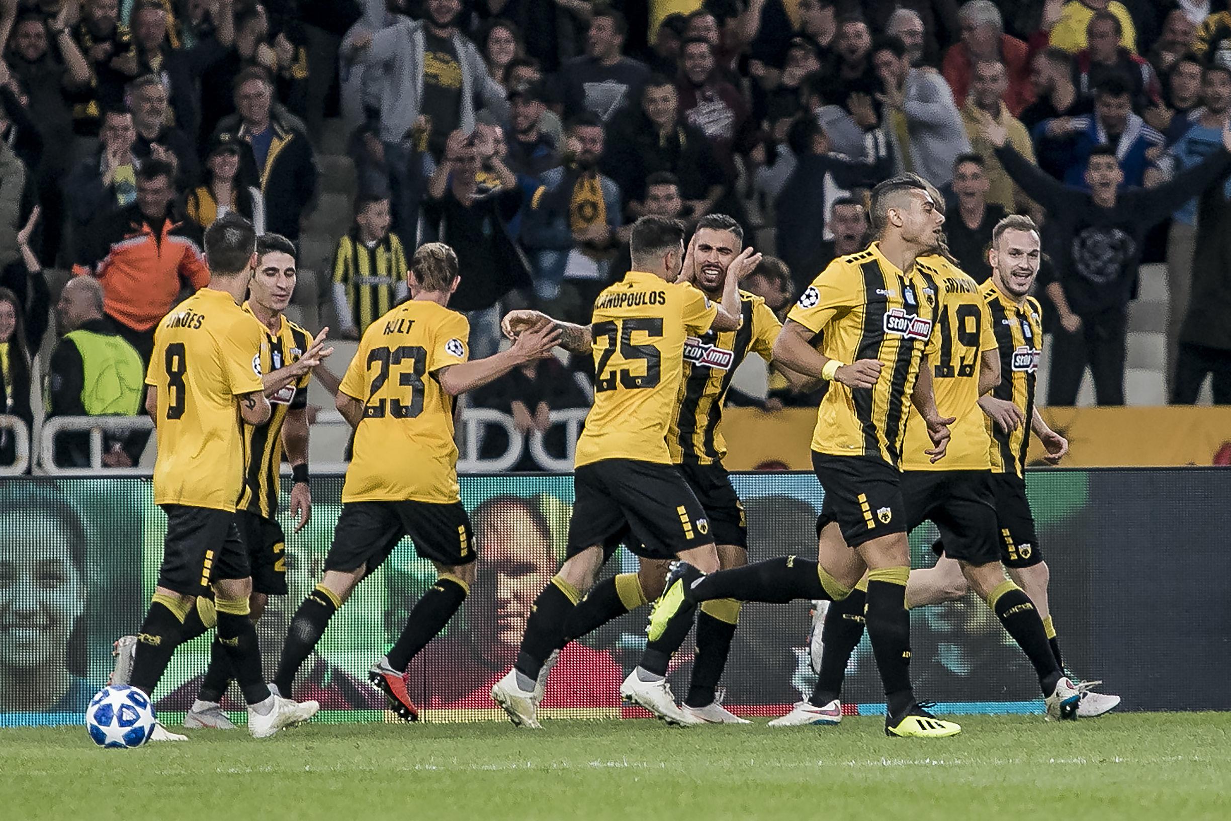 10月2日,雅典AEK队球员在比赛中庆祝进球。新华社发(帕纳约蒂斯摄)