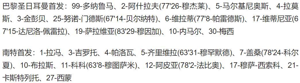 巴黎首发:80-特纳斯、2-阿什拉夫、5-马尔基尼奥斯(61’37-什克里尼亚尔)、21-卢卡斯、4-乌加特(61’33-埃梅里)、15-达尼洛-佩雷拉、17-维蒂尼亚(67’10-登贝莱)、19-李刚仁、28-索莱尔(79’11-阿森西奥)、7-姆巴佩、29-巴尔科拉(79’23-穆阿尼)