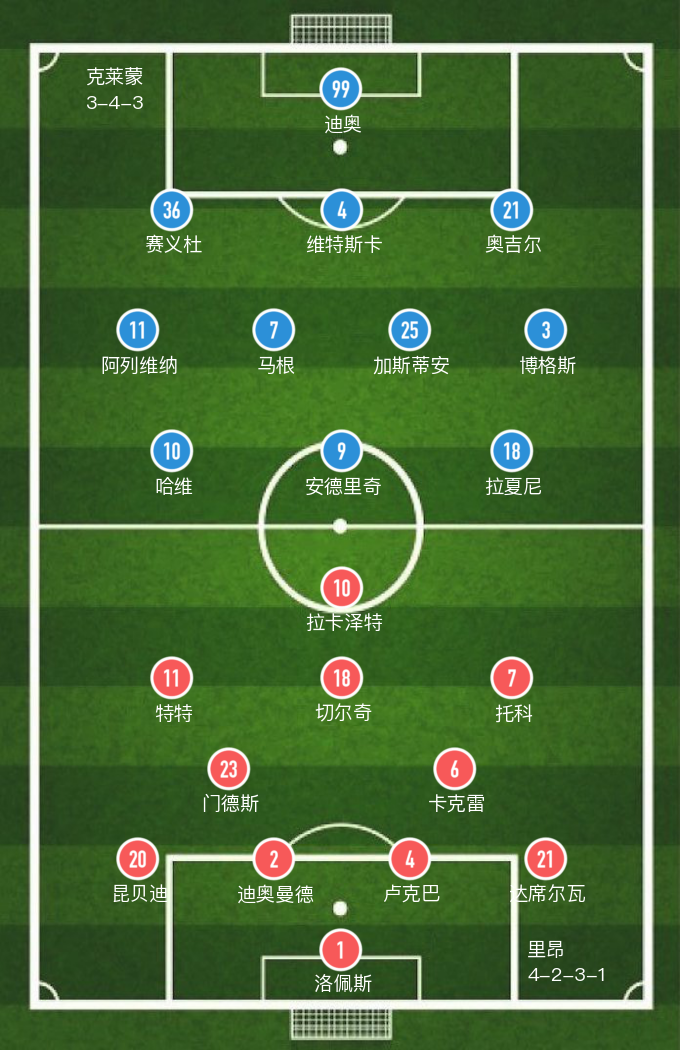 克莱蒙(3-4-3): 99-迪奥,36-赛义杜,4-维特斯卡,21-奥吉尔,11-阿列维纳(72' 70-萨拉切维奇),7-马根,25-加斯蒂安,3-博格斯,10-哈维(90' 23-拜耶),9-安德里奇(81' 95-基伊),18-拉夏尼(72' 91-贝拉)