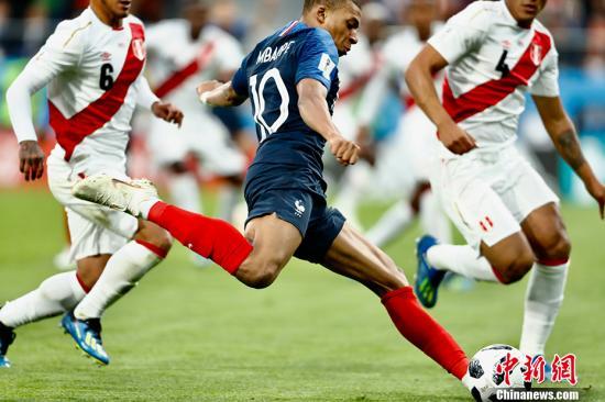中新网叶卡捷琳堡6月21日电 俄罗斯世界杯C组次轮第二场小组赛21日在叶卡捷琳堡中央体育场进行。法国19岁小将姆巴佩33分钟推射破门助法国队1-0小胜秘鲁,其也成为队史上首位19岁就世界杯比赛中获得进球的球员。小组赛两战两胜的法国队也以积6分率先获得了出线机会。